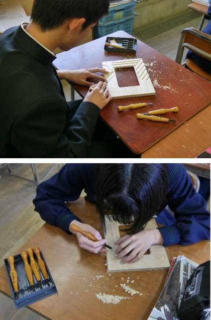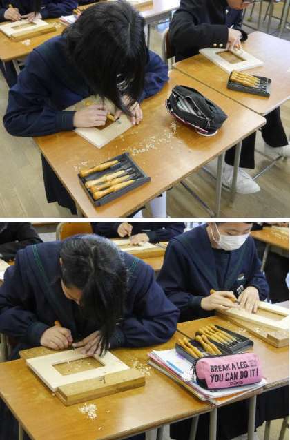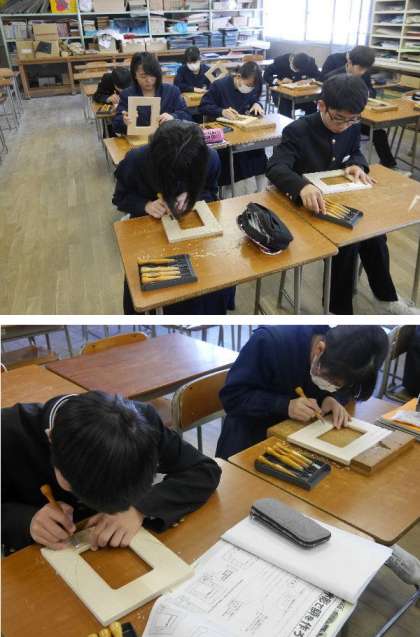 2年生の美術では額のデザインを彫刻しています。四角や線、円をモチーフとして組み合わせてデザインして彫刻している生徒も多いです。いろいろ考えながら作品づくりに励んでいます。