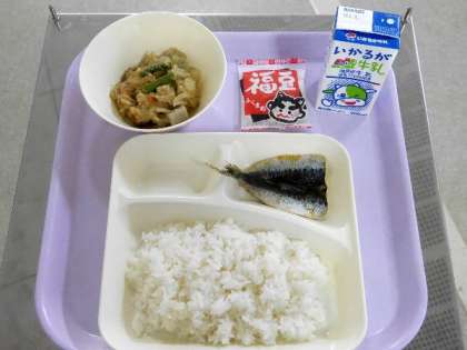 今日の献立は、ごはん、牛乳、イワシの生姜醤油かけ、ふくめに、いりだいずでした。