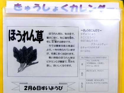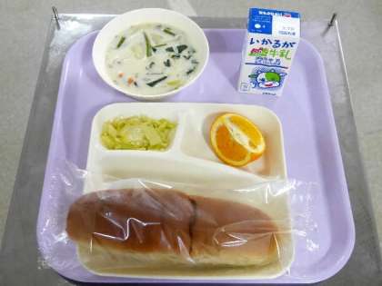 今日の献立は、黒糖パン、牛乳、ホウレンソウのクリームシチュー、キャベツのサラダ、いよかんでした。クリームシチューが最高においしかったです。パンにあいます。