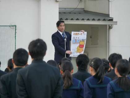 全校集会を行いました。品格教育の今月テーマについてお話しました。