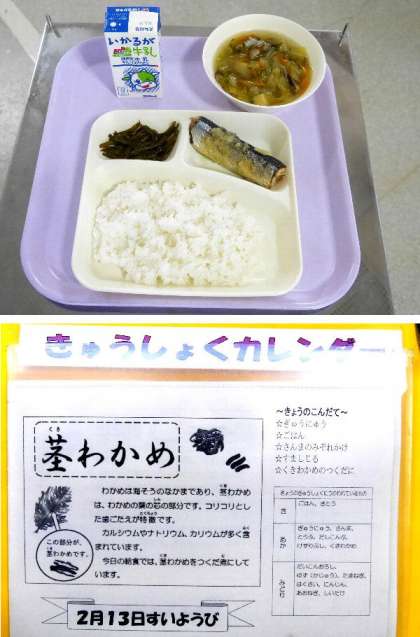 今日の献立は、ごはん、牛乳、さくまのみぞれかけ、すまし汁、茎わかめの佃煮でした。