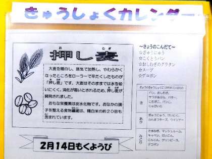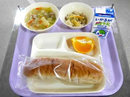 今日の献立は、黒糖パン、牛乳、押し麦のグラタン、スープ、デコポンでした。