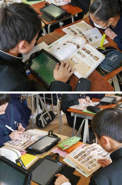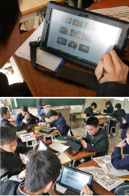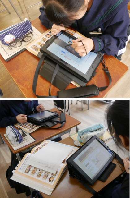 1月にタブレットが新しくなりました。タブレットを使って、1年生の家庭科では、地域の食材と郷土料理について調べています。