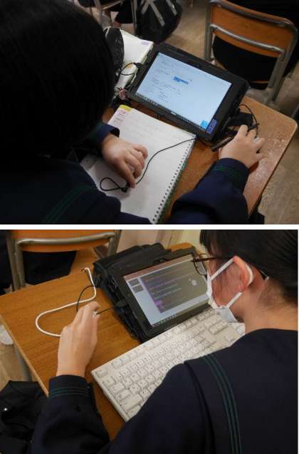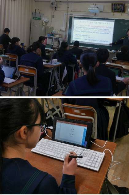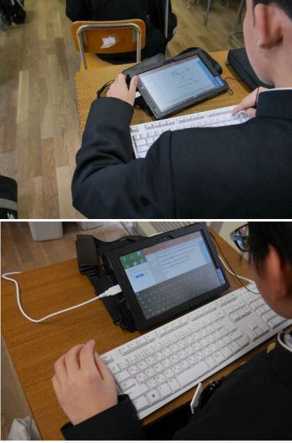1年生の英語では、先日の1年スポーツ大会を振り返って英語でプレゼンづくりです。タブレットにキーボードやマウスをつけて英文を考えて入力しています。