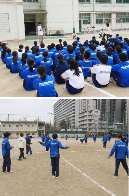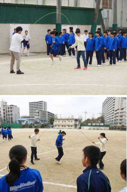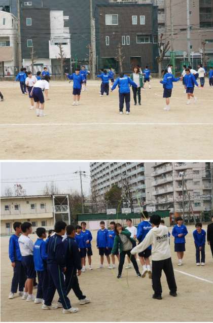 京都大学の学生サークルが東三国中学校にきていただきました。なわとびを教えていただき、楽しく運動することができました。