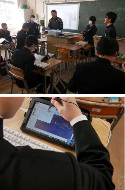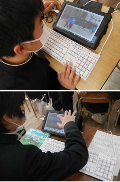 1年生の英語では、タブレットで振り返りプレゼンを英語で作っています。学年行事の写真を選んではりつけて完成です。