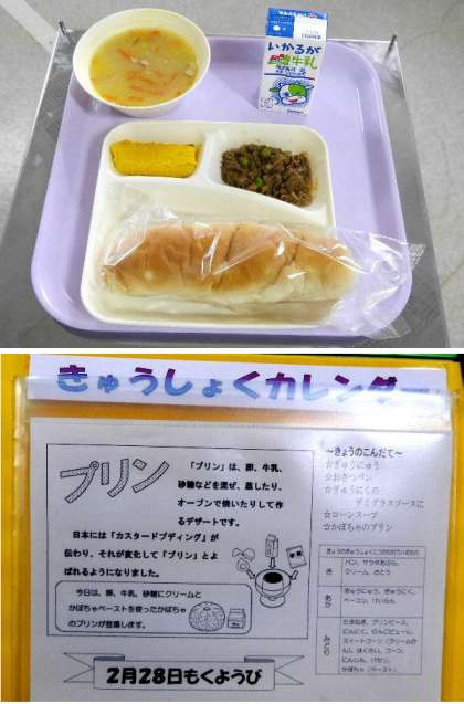今日の献立は、おさつパン、牛乳、牛肉のデミグラソース煮、コーンスープ、かぼちゃプリンでした。パンがふわふわでおいしいです。