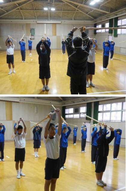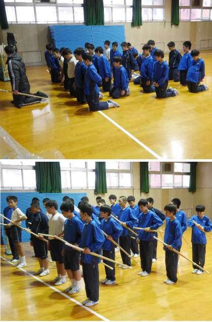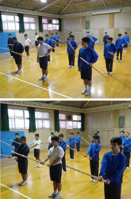 1年生の男子体育では武道として剣道を体験しています。礼の練習をして、初めて竹刀の持ち方を教えてもらい構えて練習しました。
