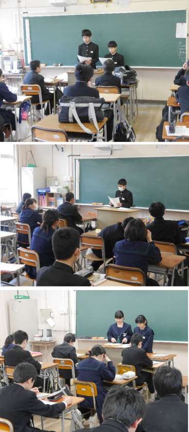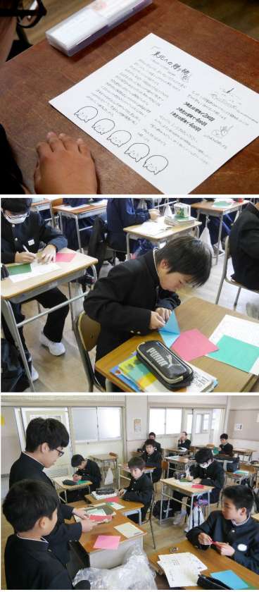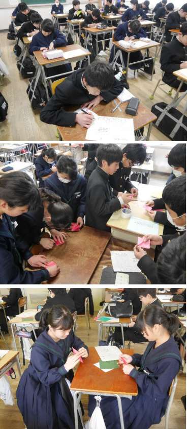 東北ボランティア研修にもっていく折鶴を1年生が折ってくれています。東北研修に参加する1年のジュニアリーダたちが各教室で説明をしてくれました。
