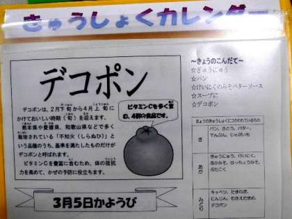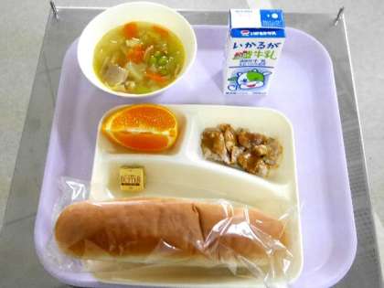 今日の献立は、パン、牛乳、鶏肉の味噌バターソース、スープ煮、デコポンでした。