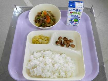 今日の献立は、ごはん、牛乳、肉じゃが、白菜のゆず風味、トラ豆の煮ものでした。今日もおいしかった満足です。