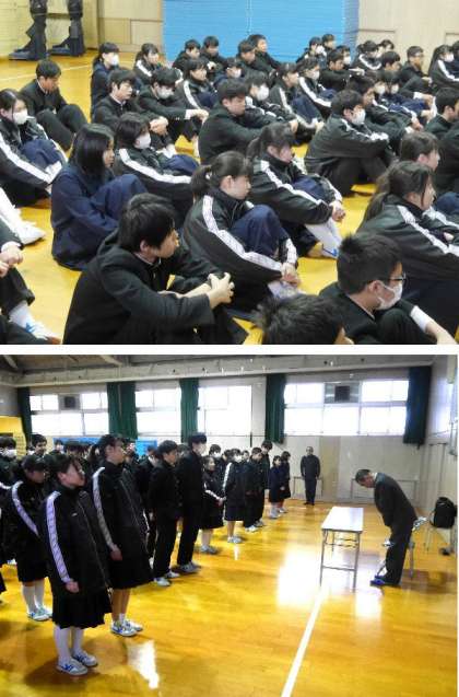 東三国地域の地域活動協議会の会長にご来校いただき、卒業する3年生に激励のお祝いの言葉をいただきました。会長さんの人生の経験をふりかって、「感謝の気持ちをもつ」「挑戦をしていく」「ぐちを言わない」とお話しいただきました。