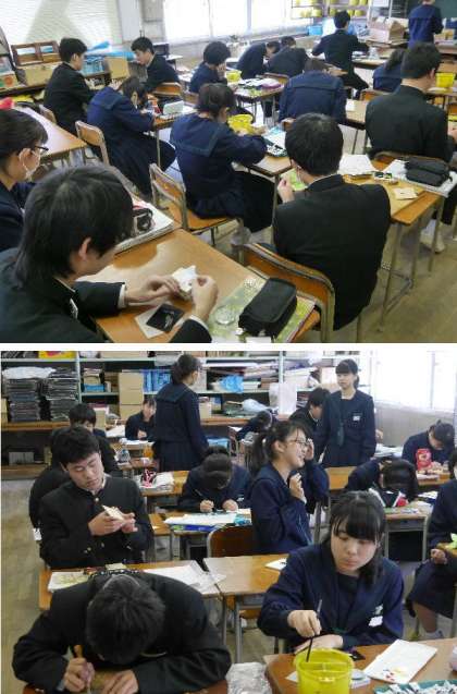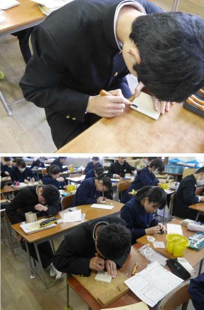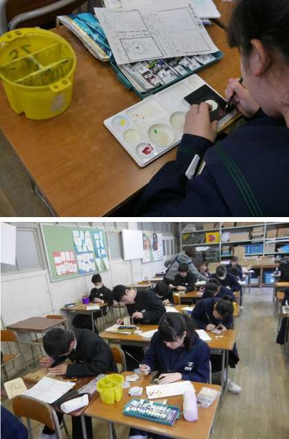 3年生は、卒業式まで1週間ありませんね。ひとつひとつの授業が、中学校生活最後の授業となります。美術の授業では、最後まで作品づくりにがんばっています。生徒によっては、卒業して美術の授業を受けることがないかもしれません。大切にしてほしいですね。