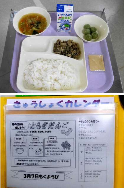今日の献立は、ごはん、牛乳、豚肉とレンコンの炒め物、すまし汁、きなこよもぎだんごでした。おだんごにきな粉をかけておいしかったですね。