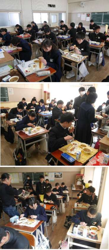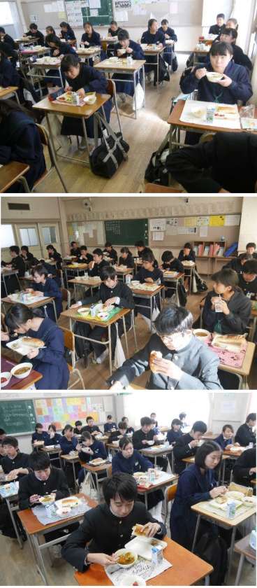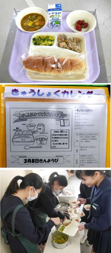 今日の献立は、パン、牛乳、カレーシチュー、フライドチキン、春のカラフルソテー、いちごでした。子どもたちの大好きな献立です。