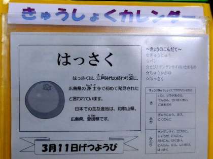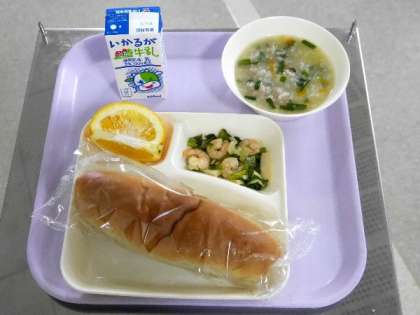 今日の献立は、パン、牛乳、えびとチンゲン菜の炒め物、中華がゆ、はっさくでした。