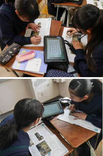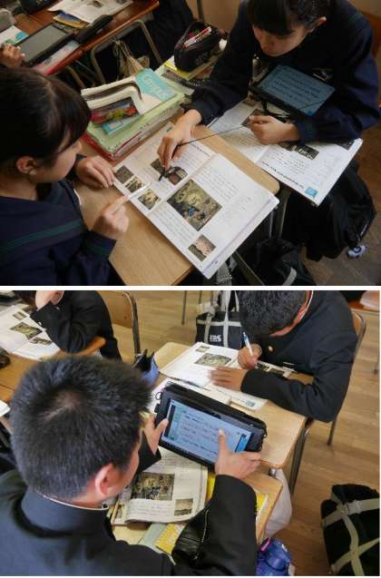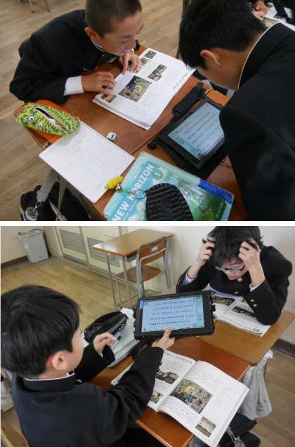 1年生の英語の授業です。ペアになって、タブレットで教科書の英語の発音や意味を調べています。わからない英文をペンでタッチするだけで発音が聞けます。便利になりました。