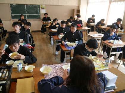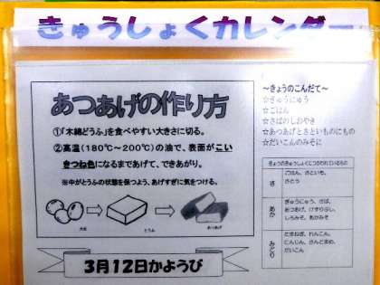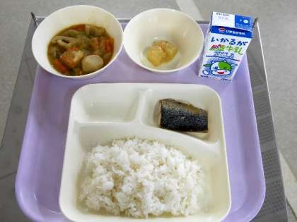 今日の献立は、ごはん、牛乳、サバの塩焼き、厚揚げと里芋の煮物、大根の味噌煮でした。3年生は明日で給食がおわりますね。