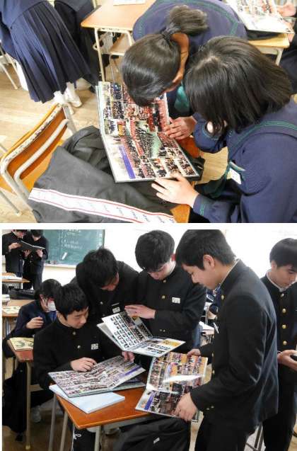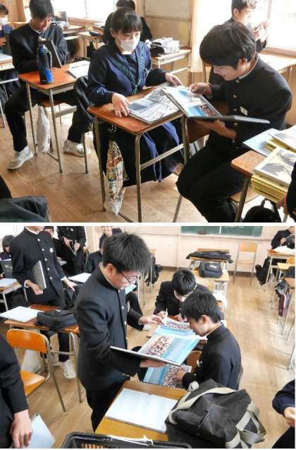 また、教室では卒業アルバムと文集が配られました。くいいるようにアルバムを見ています。