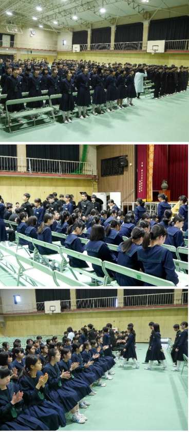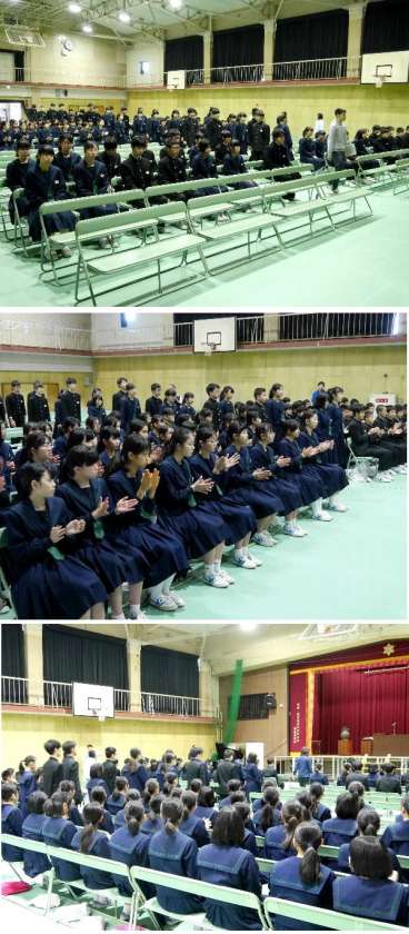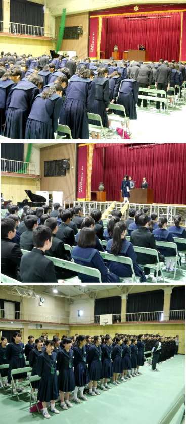 明日の卒業式の予行をおこないました。在校生は2年生全員と1年生の代表生徒が一緒に参列して練習しました。本番どおりの次第にそって確認が行われました。