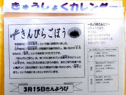 今日の献立は、ごはん、牛乳、鶏肉の照り焼き、さつまいもの味噌汁、きんぴらごぼうでした。