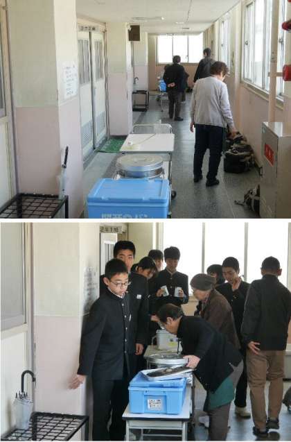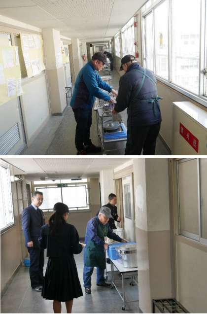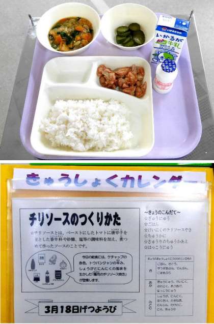 今日の献立は、ごはん、牛乳、鶏肉のチリソース焼き、中華煮、キュウリの中華あえ、発酵乳でした。明日で今年度の給食も終わります。元気アップボランティアさんには、1年間お世話になりありがとうございます。