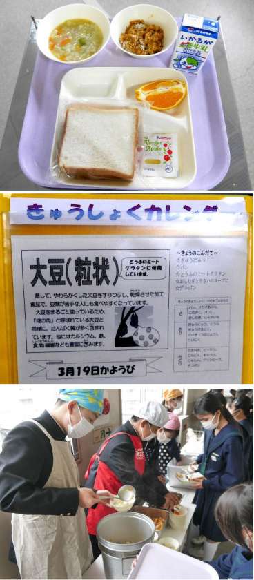 今日の献立は、パン、牛乳、豆腐のミートグラタン、おし麦と野菜のスープ煮、デコポンでした。毎日、とてもおいしくいただきました。