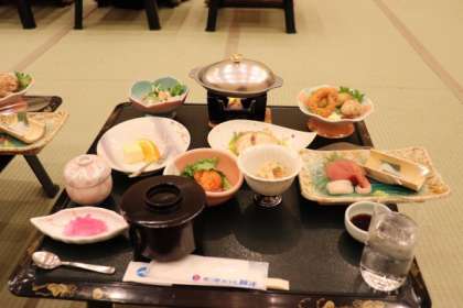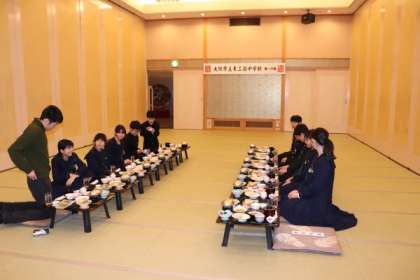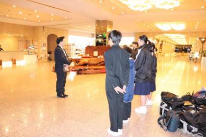 昨夜の様子です。入館式を終え、豪華な夕食をいただいたあとは、女将さんの震災に関する講話を聞かせていただきました。