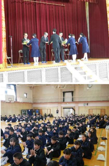 本日は、本年度末で転任される先生方の離任式をおこないました。1・2年生と卒業した3年生、OBの生徒たちも多数きてくれました。転任される先生方からお言葉をいただき、生徒代表の挨拶のあと、花束の贈呈がありました。また、別室にて、PTAとの離任式も行われました。
