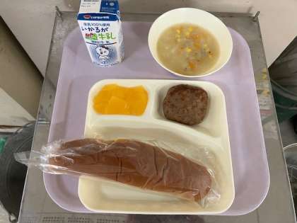 8月26日(火)、2学期最初の給食は、黒糖パン、焼きハンバーグ、豆乳スープ、ダイスゼリー(みかん)です。