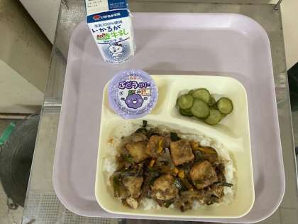 8月27日(水)の給食は、マーボーあつあげ丼(どんぶり)、きゅうりの中華あえ、ぶどうゼリーです。