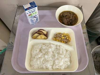 9月2日(火)の給食は、ごはん、マーボーなす、ツナと野菜のいためもの、焼きさつまいもの甘みつかけ、です。