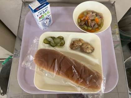 9月3日(水)の給食は、黒糖パン、牛乳、鶏肉のバジル焼き、ベーコンと野菜のスープ煮、キャベツときゅうりのサラダ、です。