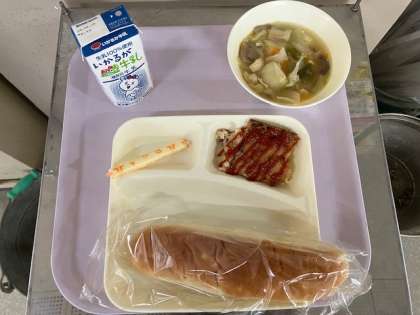 9月5日(金)の給食は、おさつパン、牛乳、とうふローフ、ケチャップ(袋・とうふローフ)、洋風煮、棒チーズ、です。