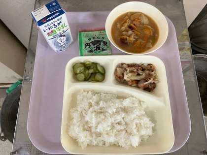 9月8日(月)の給食は、ごはん、牛乳、鶏肉の塩こうじ焼き、さつまいものみそ汁、きゅうりの甘酢あえ、ソフト黒豆、です。