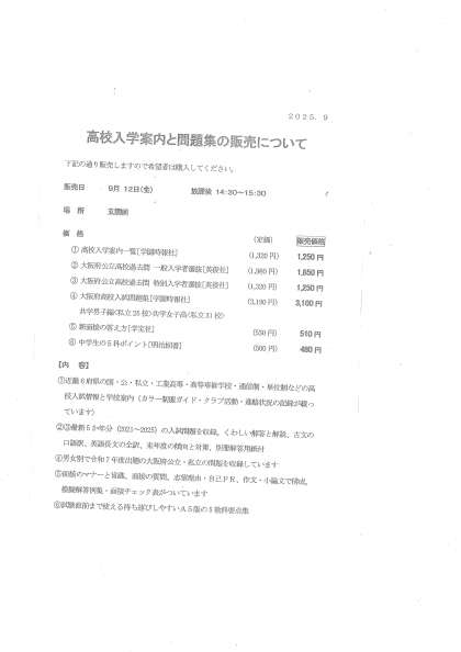 高校入学案内と問題集の販売につきまして(9月10日(水))