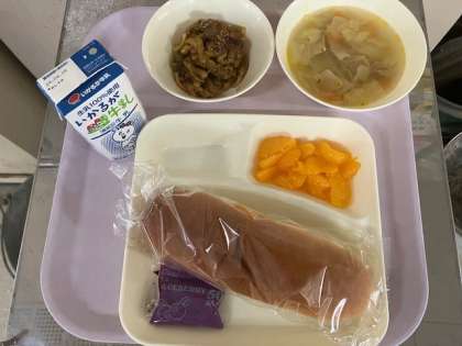 9月18日(木)の給食は、コッペパン、ブルーベリージャム、カレーマカロニグラタン、