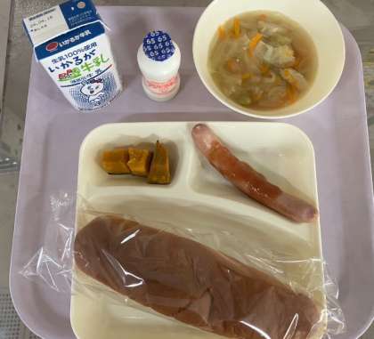 9月22日(月)の給食は、黒糖パン、ウインナーのケチャップソース、スープ、焼きかぼちゃ、発酵乳、です。