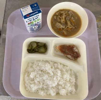 10月6日(月)の給食は、ごはん、牛乳、あかうおのしょうゆだれかけ、豚汁、きゅうりのゆず風味、です。
