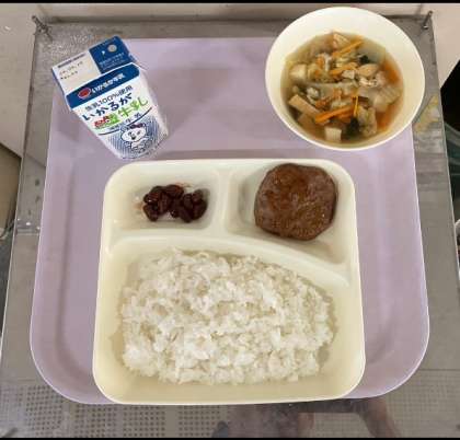 10月14日(火)の給食は、ごはん、牛乳、和風ハンバーグ、五目汁、金時豆の煮もの、です。