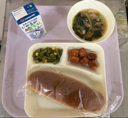 10月15日(水)の給食は、黒糖パン、牛乳、まぐろのオーロラ煮、スープ、さんどまめとコーンのサラダ、です。