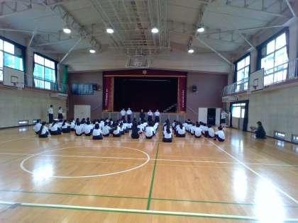 1年生の学年集会の様子です。今日の学年集会では、昨日行われた各種委員会での報告がありました。今学期の目標・今月の目標・その目標に対する具体的方策を各委員会から報告しました。後期からは1・2年生が中心で活動することになります。とても堂々と報告をしていました。この人数の前で、芝居形式で発表した委員会もありました。