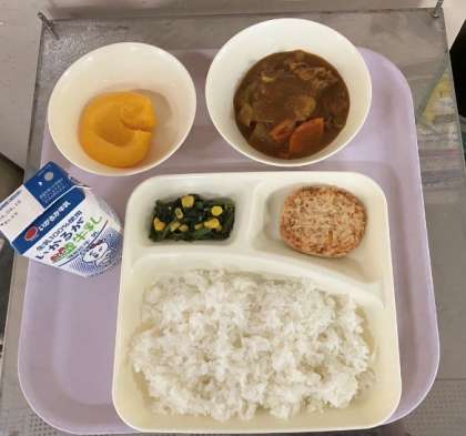 10月21日(火)の給食は、ポークカレーライス、牛乳、焼きとうふハンバーグ、ほうれんそうのソテー、黄桃(缶)、です。
