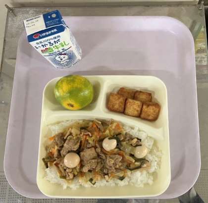 10月24日(金)の給食は、中華丼、牛乳、あつあげの中華だれかけ、みかん、です。