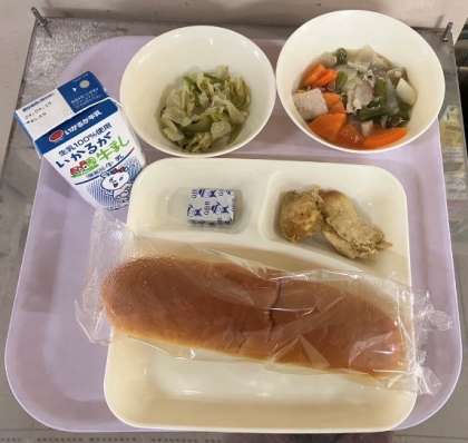 10月27日(月)の給食は、パンプキンパン、牛乳、鶏肉のカレー風味焼き、スープ煮、野菜のソテー、固形チーズ、です。