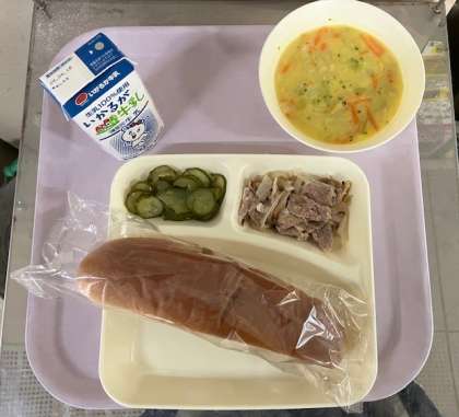 10月29日(水)の給食は、黒糖パン、牛乳、豚肉のガーリック焼き、コーンスープ、きゅうりのバジル風味サラダ、です。
