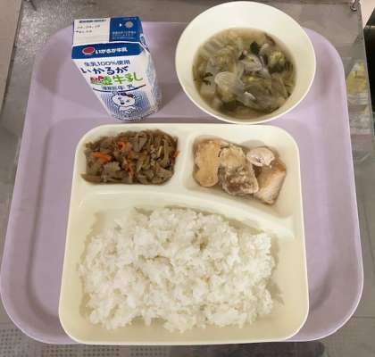 11月5日(水)の給食は、ごはん、牛乳、鶏肉のおろしじょうゆかけ、うすくず汁、きんぴらごぼう、です。