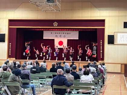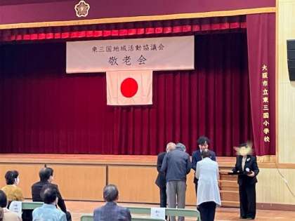 東三国地域では、9月は暑さがひどいため、本日に敬老会を行いました。東三国中学校では、吹奏楽部がオープニングアクトとして3曲演奏をさせていただきました。後半には、淀川区長の演奏、マッキーのマリオネット、和太鼓の演奏が披露されました。