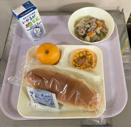 11月11日(火)の給食は、コッペパン、ブルーベリージャム、牛乳、豚肉と野菜のスープ煮、変わりピザ、みかん、です。