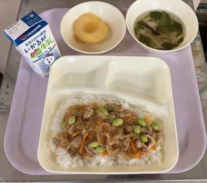 11月14日(金)の給食は、ピリ辛丼、牛乳、中華スープ、白桃(缶)です。
